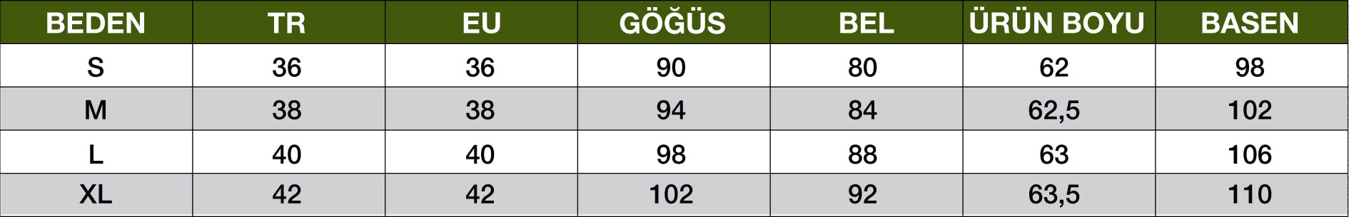 XL Beden Ürün Boyu:63,5 cm Göğüs:102 cm Bel:92 cm Kalça:110 cm
