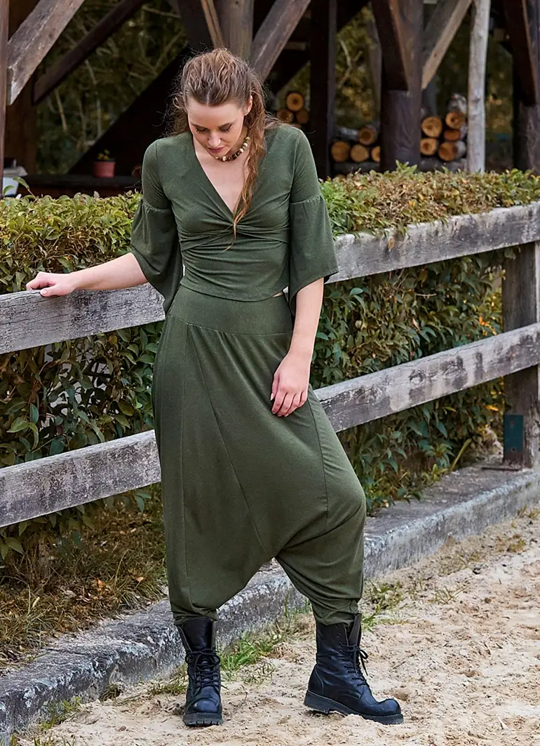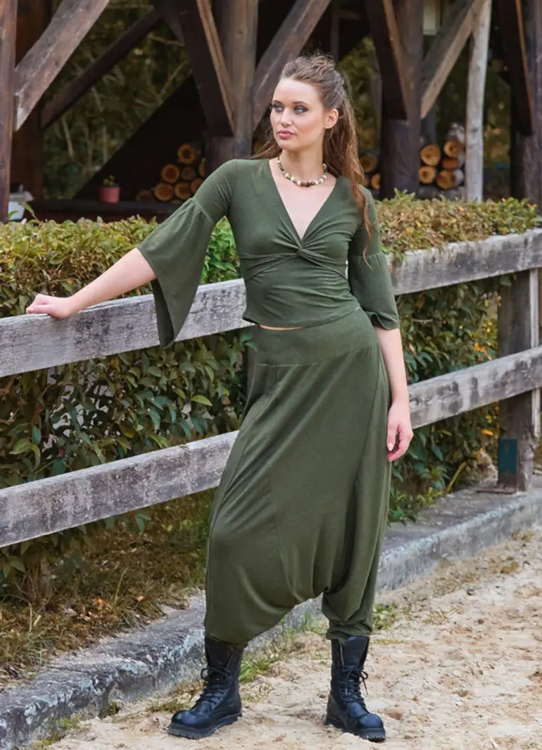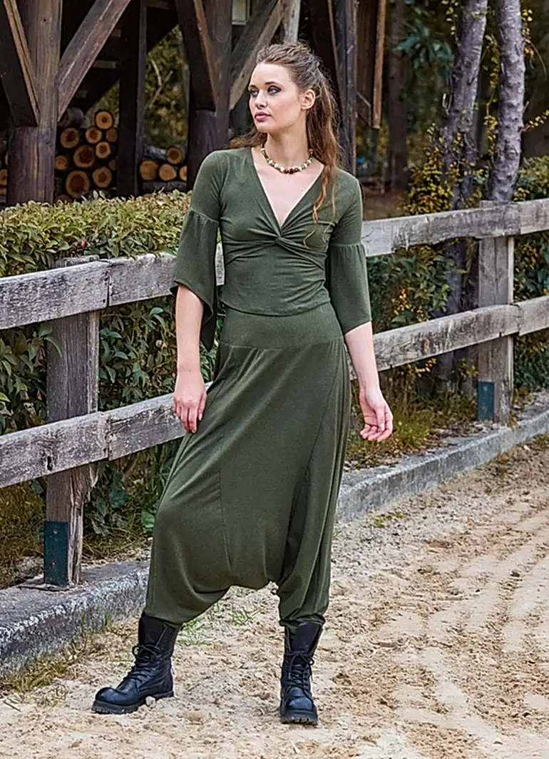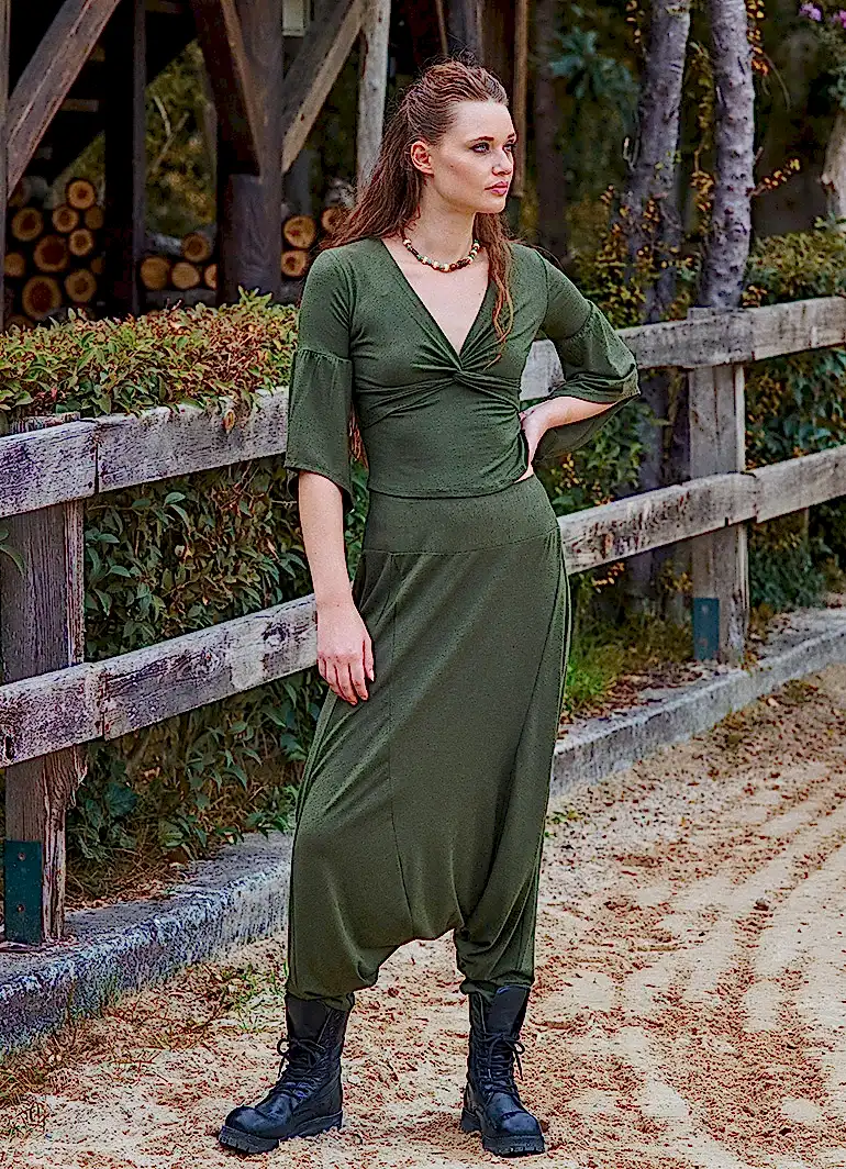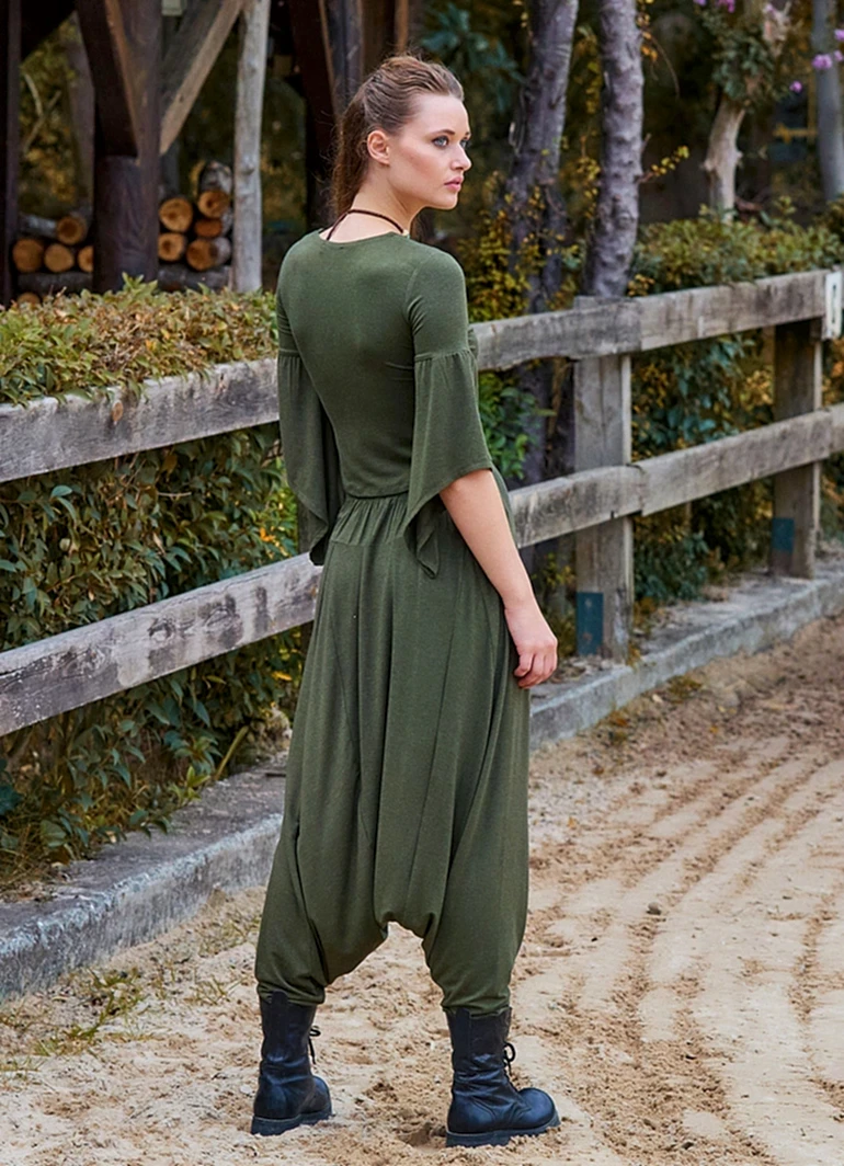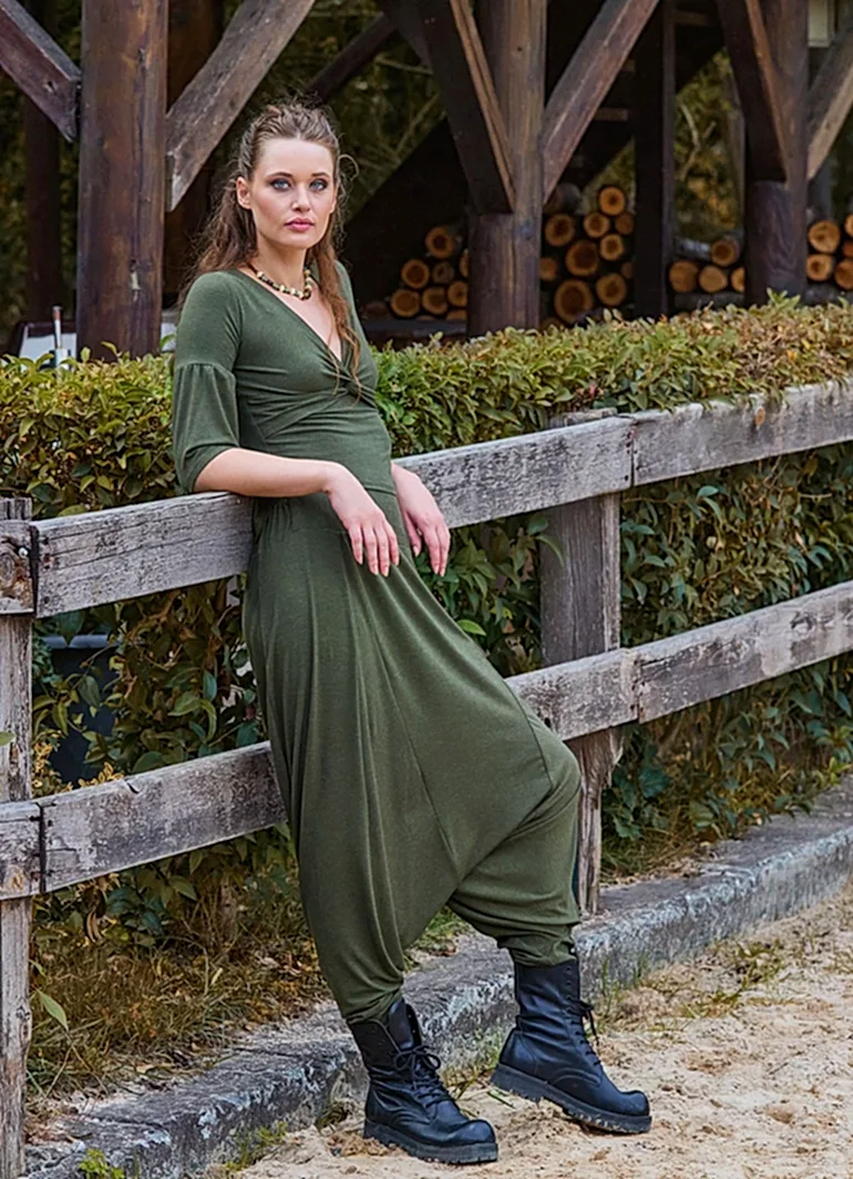 Paçası lastikli ve düşük ağ yapısıyla rahatlığı ön planda tutan bu haki bohem şalvar, günlük kombinlerinizin vazgeçilmezi olacak. Salaş ve özgür kesimi sayesinde hem evde hem dışarıda şıklığı ve konforu bir arada yaşayın.