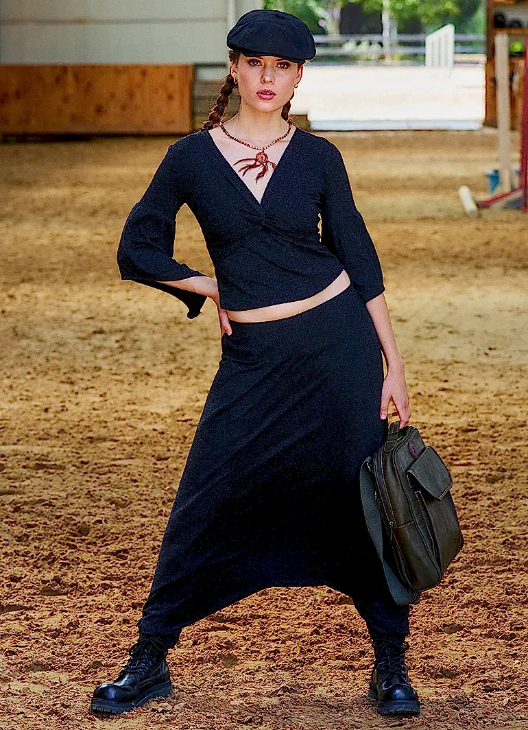 Paçası lastikli, düşük ağı ve salaş kesimiyle öne çıkan bu siyah kadın pantolon, hem şıklığı hem de rahatlığı bir arada sunar. Bohem tarzıyla günlük ve özel kombinlerin vazgeçilmezi olacak.