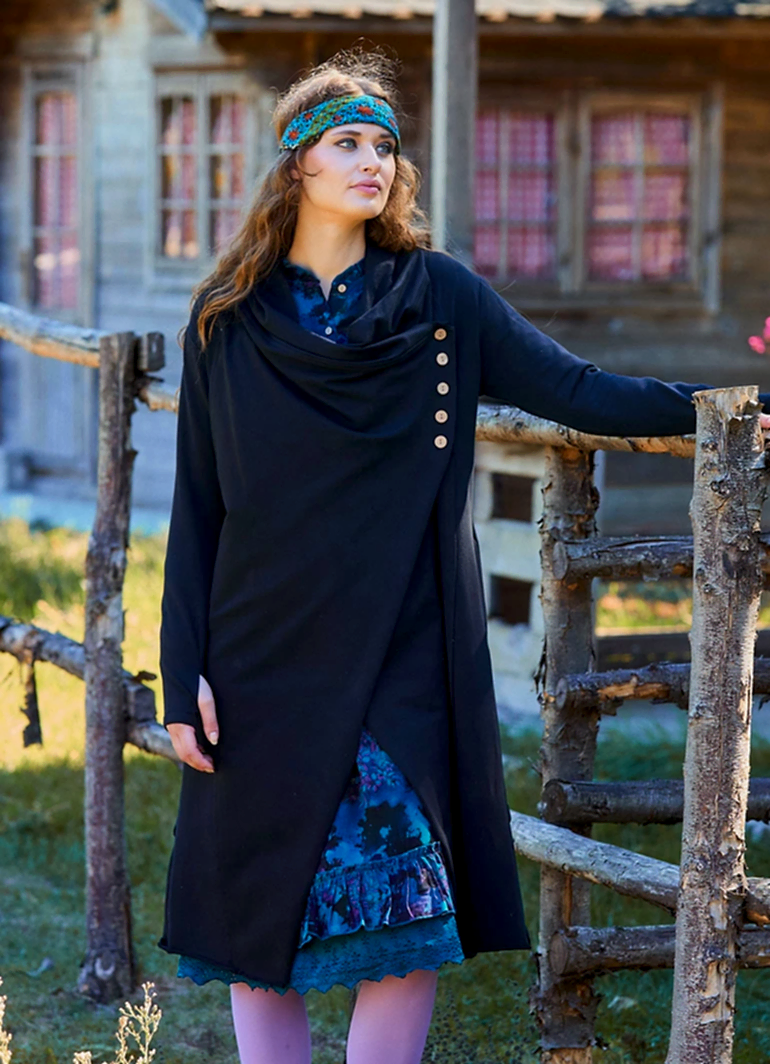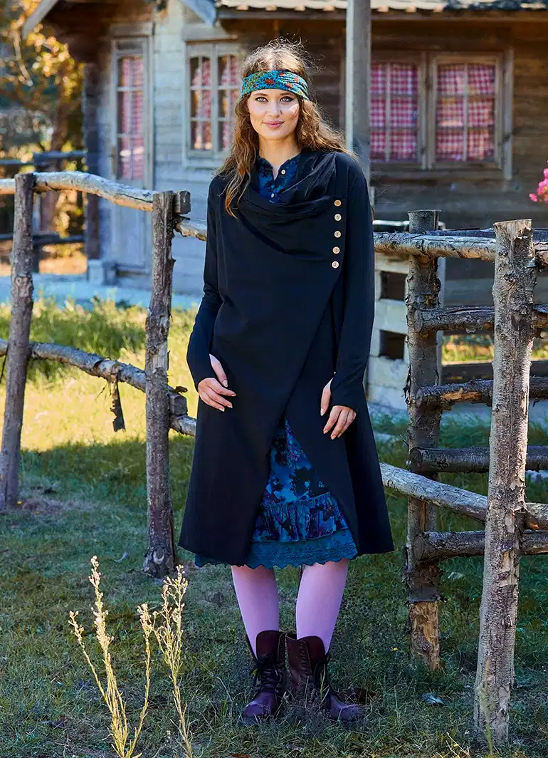 Parmak geçmeli düğme detayları ve dökümlü kapşon tasarımıyla öne çıkan siyah bohem hırka, şıklığı ve konforu bir araya getiriyor. Günlük kombinlerinize modern bir dokunuş katarken, bohem tarzı ile özgün bir stil sunar.