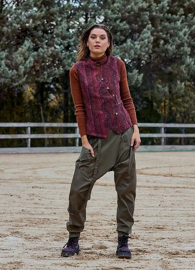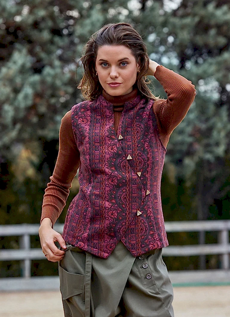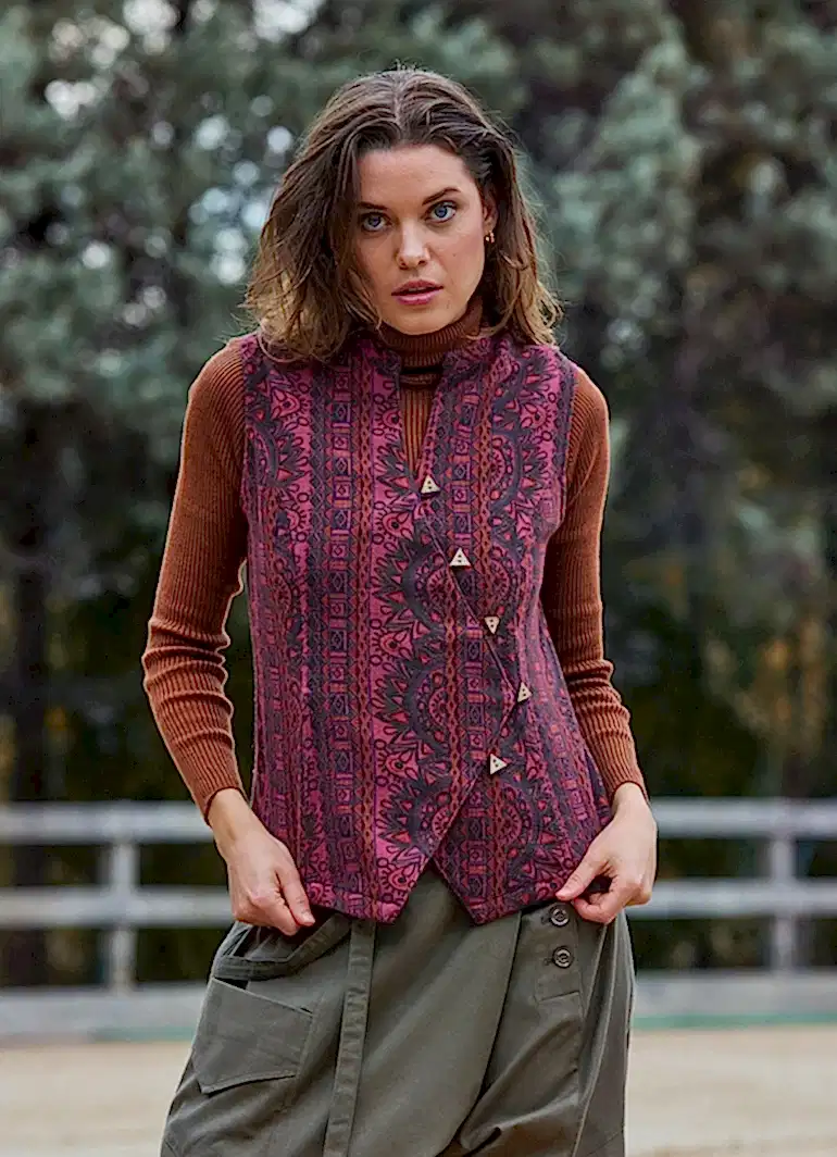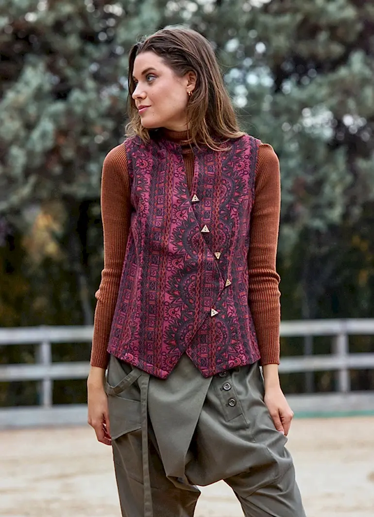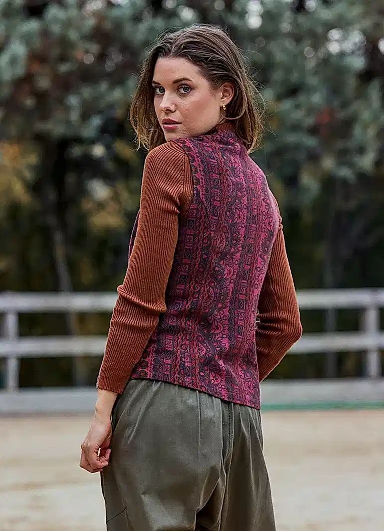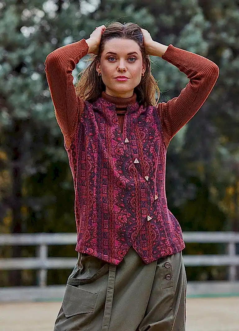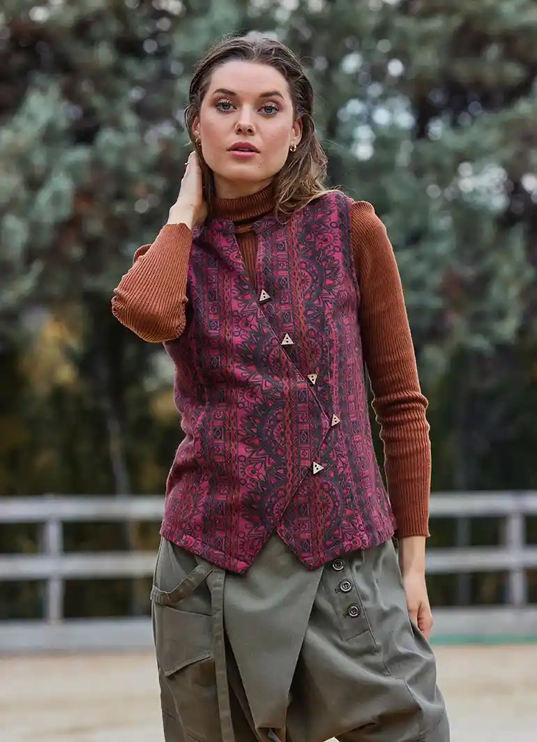 V Yaka Çapraz Düğmeli Bordo Etnik Bluz 7116, sade şıklığı bohem detaylarla buluşturur. V yaka ve çapraz düğme formu, klasik bluzlara modern bir dokunuş kazandırırken bordo tonuyla zamansız bir zarafet sunar.